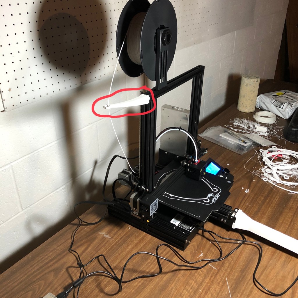 A good example of a freely available printer modification is the simple filament guide. The filament spool holder on my Ender 3 Pro sits atop the printer and the filament is fed through a tube by being pushed by a motorized gear toward the “hot end” at the end of the tube where the molten plastic is extruded in a controlled manner to build the printed object one layer (aka slice) at a time. Since the filament spool is directly above the feed mechanism, the filament is pulled from the spool and enters at a potentially acute angle which can cause extra friction in the feed mechanism. The filament guide holds the filament out and away from the feed mechanism allowing for a more direct entry for the filament in to the feed mechanism.